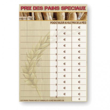Deux modèles au choix : "Prix des pains spéciaux" ou “Prix du pain”